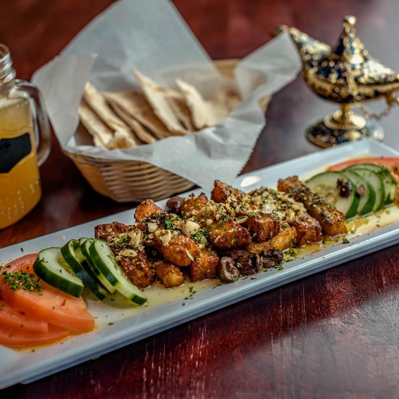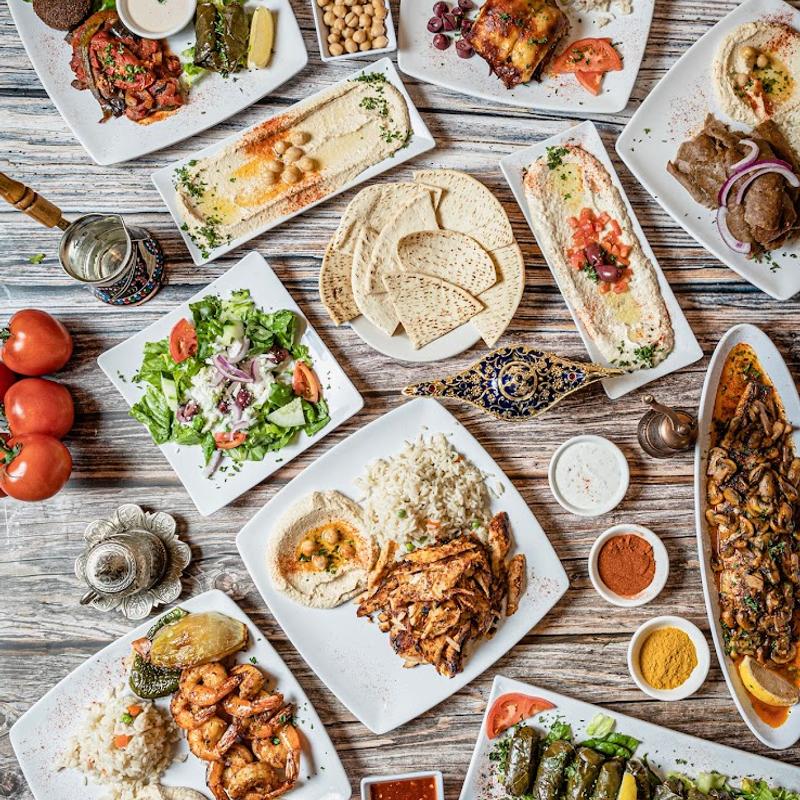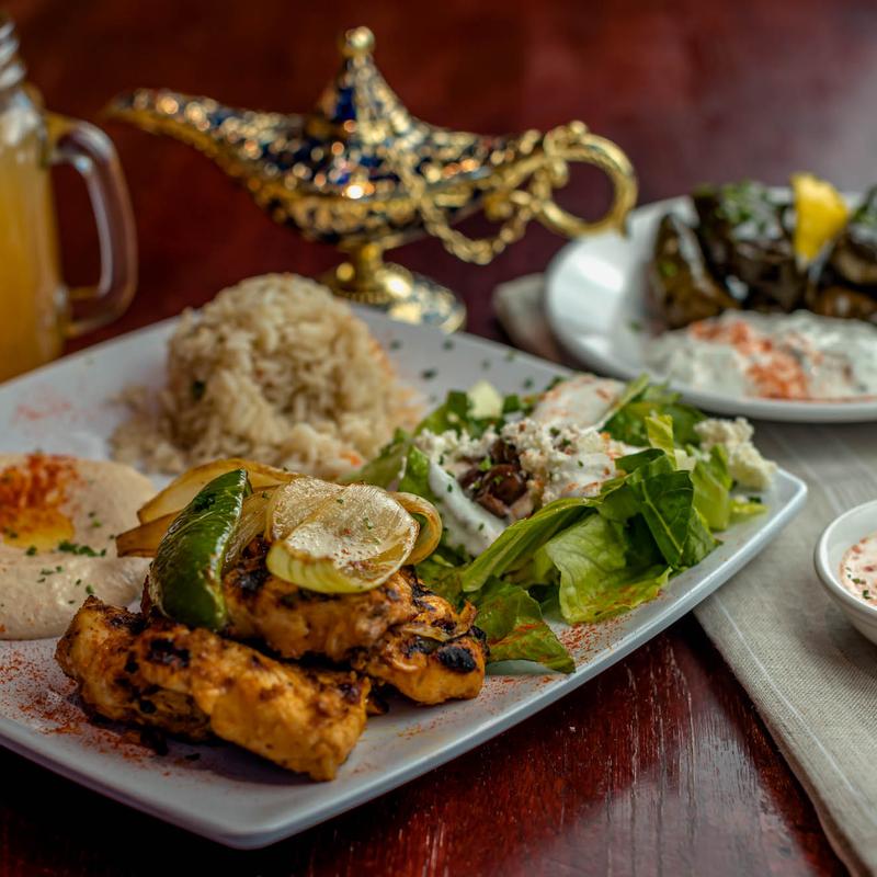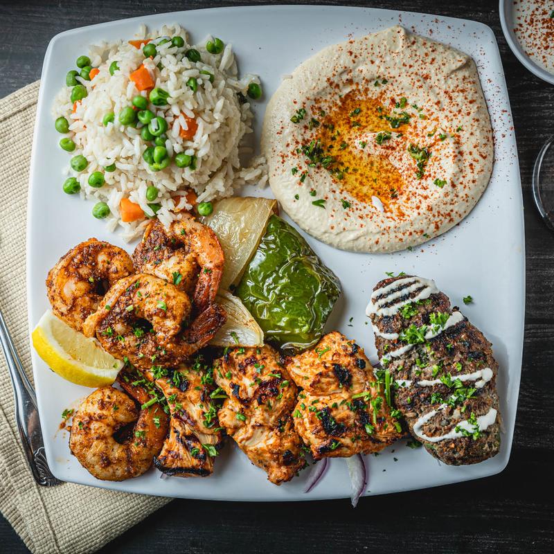 Served with 2 choices of proteins, hummus, tzatziki, rice pilaf, salad, pita bread, dolma, falafel, Petra pickles and turnip •