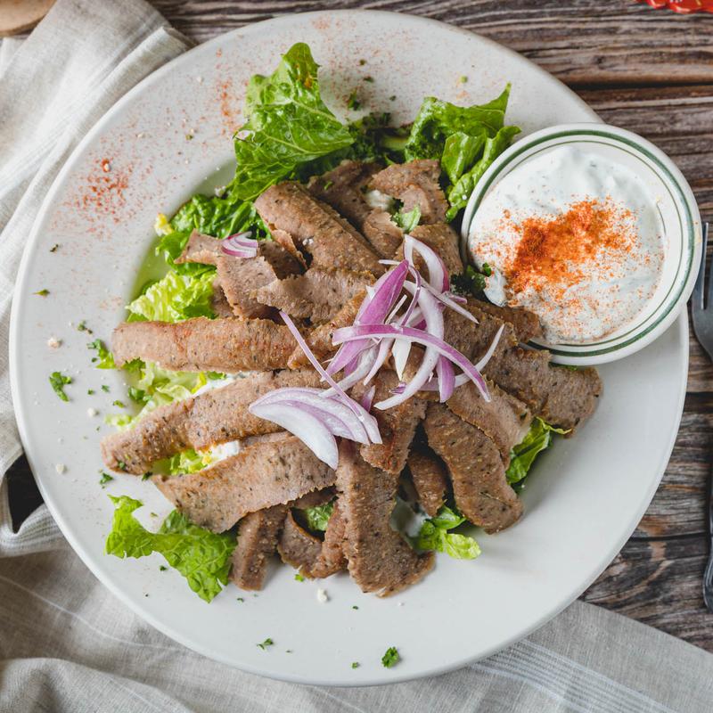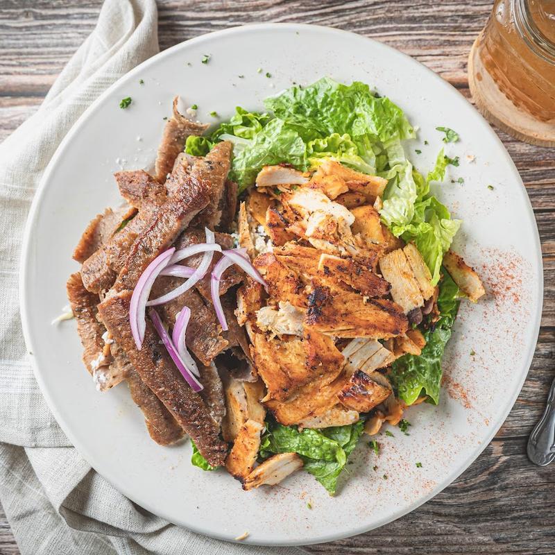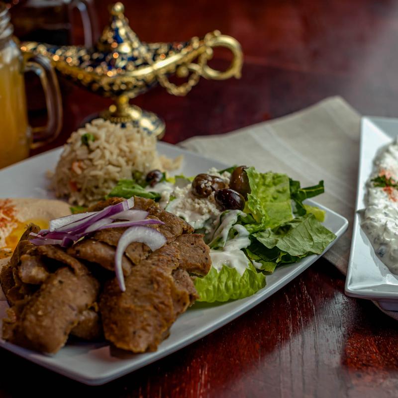 Served with 2 choices of proteins, hummus, tzatziki, rice pilaf, salad, and pita bread. •