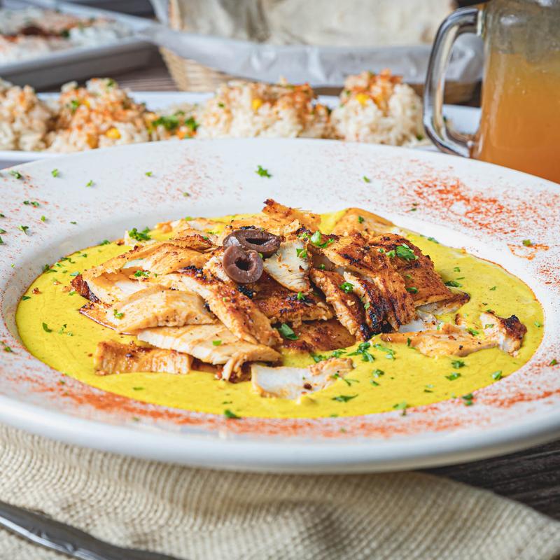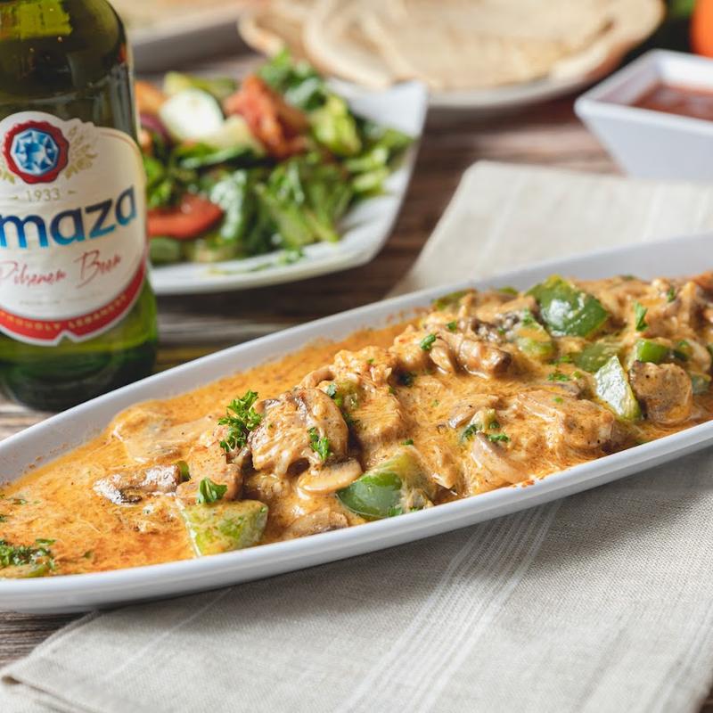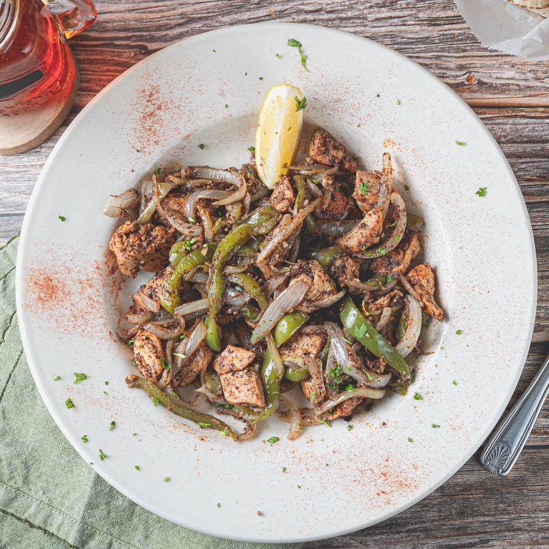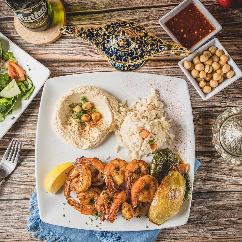 Jumbo shrimp cooked with onions, garlic, bell pepper and mushrooms. Served with rice, hummus and salad.