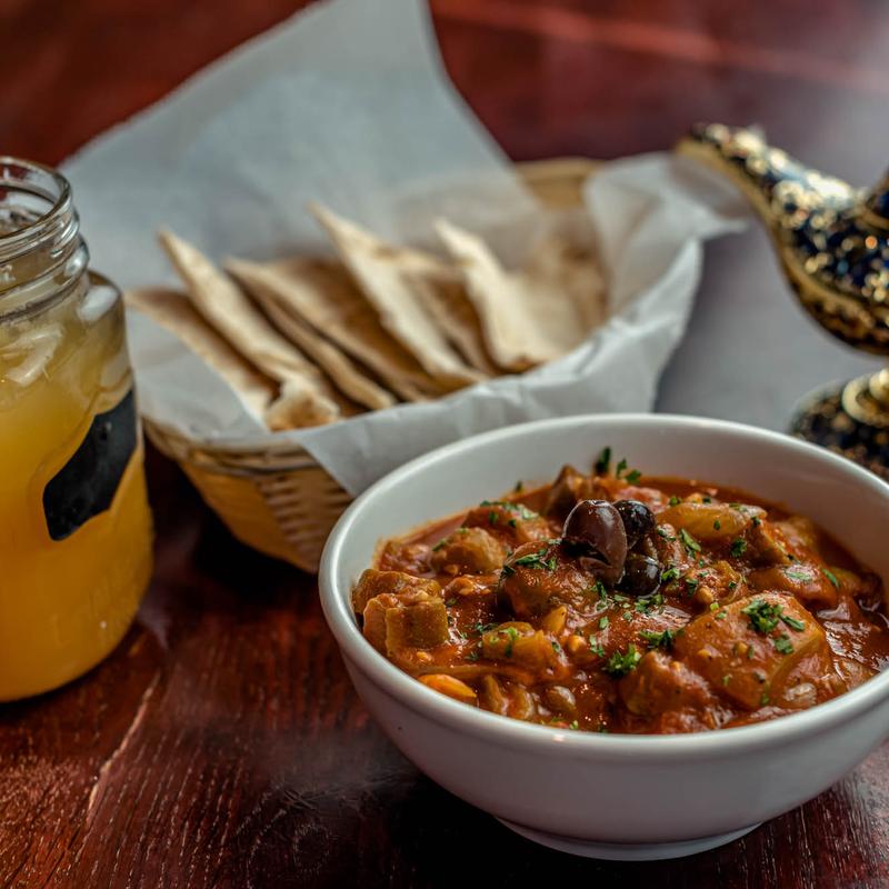 Choose 5, salad included: Hummus | Garlic Dip | Tzaziki Sauce | Dolma | Falafel | Spaniko Pita | Baba Ganoush and Rice | Eggplant Musaka | Okra Moussaka | Cauliflower | Grape Leaves | Turnip Pickles | Petra Pickles.