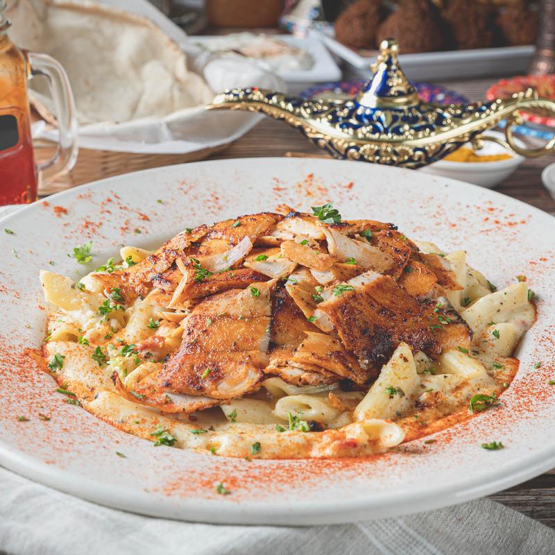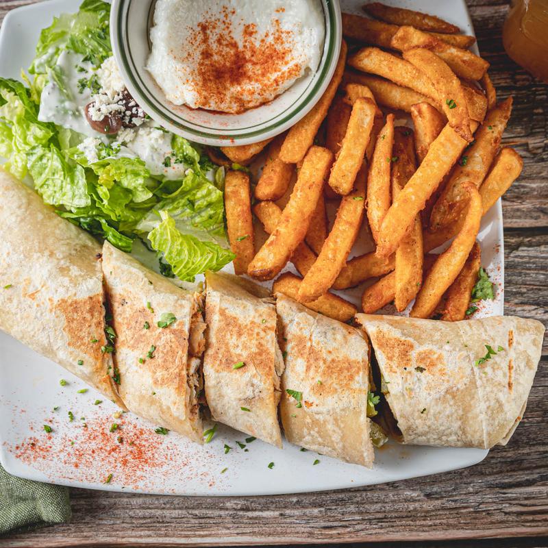 Large thin pita stuffed with chicken shawarma, house dip and homemade Arabic pickles, served with salad, fries, and house dip.