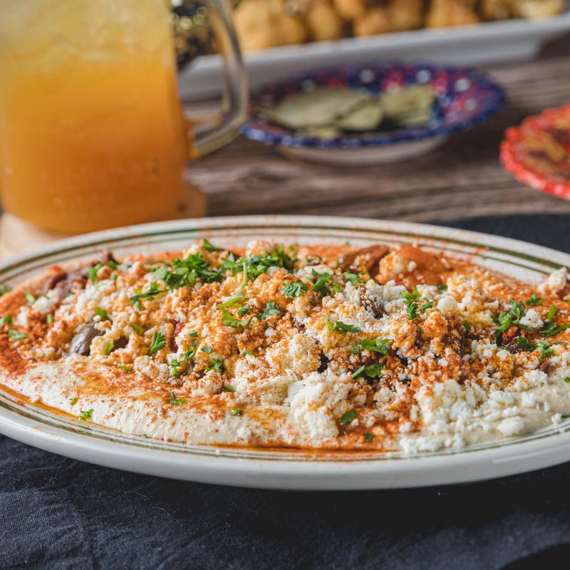 Hummus topped with tomatoes, sun-dried tomatoes, olives, pickled garlic, feta cheese and olive oil.