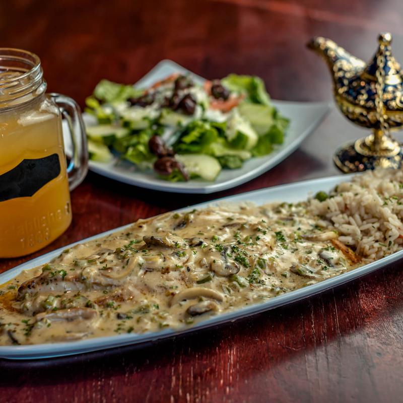 Topped with sautéed mushrooms, served with rice, hummus and salad.